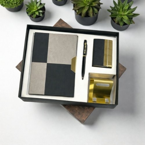 This elegant combo includes a stylish hardcover notebook for notes and planning, a premium metal pen for smooth writing, a sleek card holder for business or credit cards, and a mobile stand for hands-free convenience. Each item features a modern and premium finish, making it ideal for office desks and professional environments.