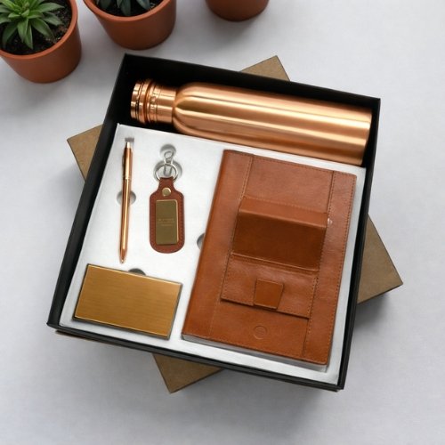 This beautifully curated combo includes a stylish copper-finish bottle, a premium textured notebook (diary), a smooth writing pen, and useful accessories like a keychain and card holder. The rich copper theme gives it a unique and classy look, making it stand out from regular gift sets.