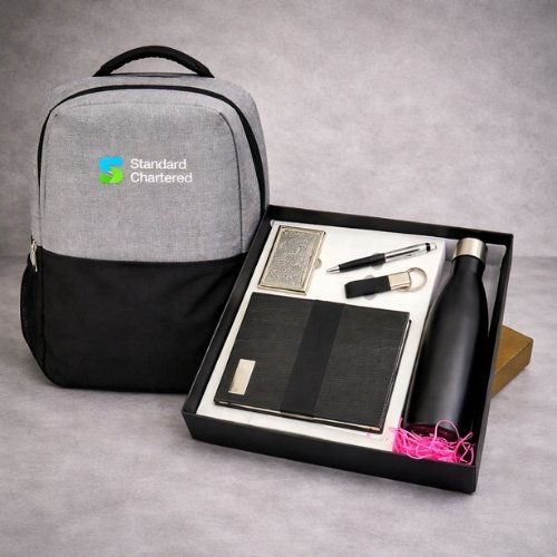 Impress your employees from day one with this premium employee welcome kit, designed for a sophisticated corporate onboarding experience. This executive gift set includes a stylish backpack along with a premium diary, sleek metal pen, vacuum insulated bottle, keychain, and an elegant card holder.