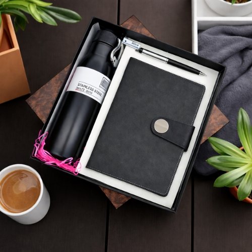 This thoughtfully curated set includes a sleek hardcover notebook for notes and planning, a durable stainless steel bottle to keep beverages handy throughout the day, and a smooth-writing pen for daily use. All items come neatly packed in a premium gift box, making it an excellent ready-to-present option.
